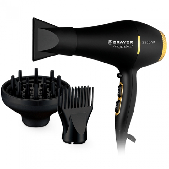 Фен BRAYER 3010BR 2200Вт, АС мотор, 2 cкор, 3 темп, узкий конц., диффуз, гребень, холод.