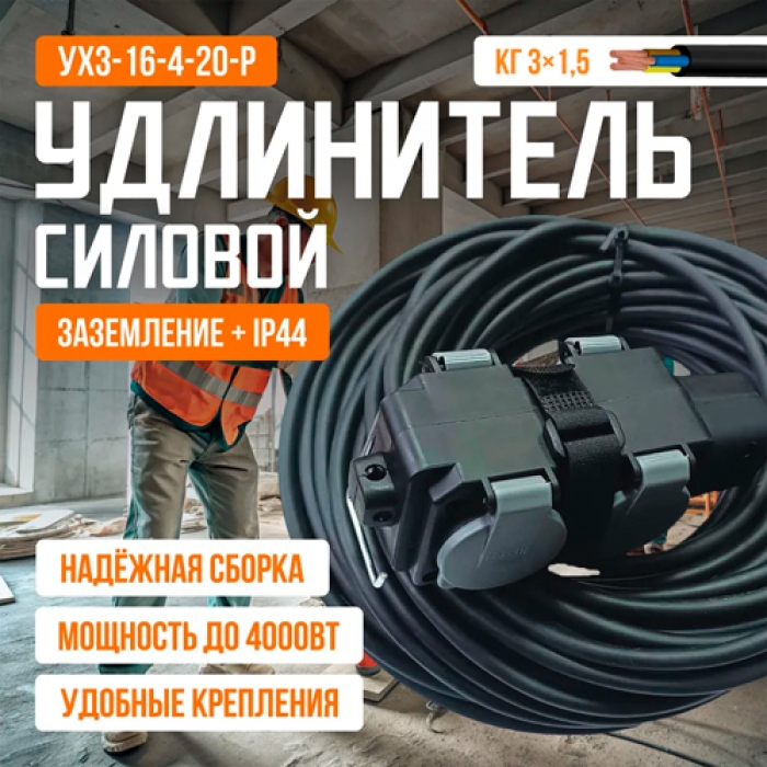 Удлинитель силовой с заземлением 20м/4роз (КГ 3*2,5) 16А/4000Вт, РП16-004 с крышками (серый)