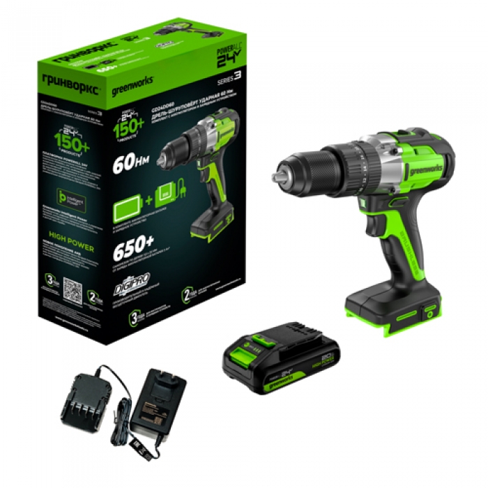 Дрель-шуруповерт ударная аккумуляторная Greenworks GD24DD60, б/щет, 30/60Нм,1х2Ач,ЗУ,кор(3704107CUA)
