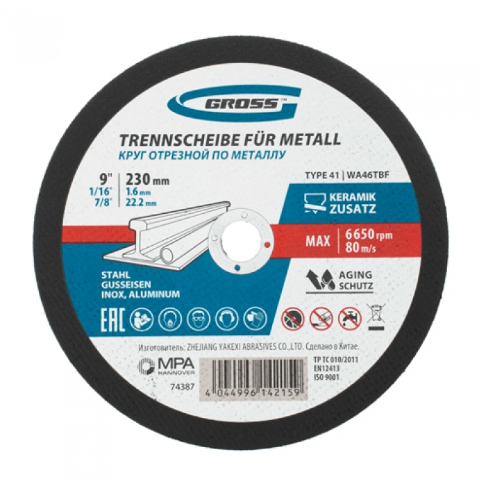 Круг отрезной по металлу, 230 х 1,6 х 22,2 мм, WA46TBF// Gross арт.74387