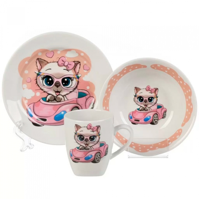 Набор детской посуды фарфор, 3 шт, Кэт в кабриолете, тар 17.5 см, сал 360 мл, круж 210 мл 489546