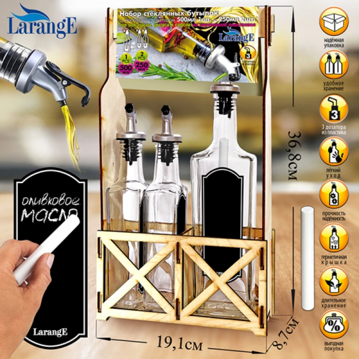 Набор бутылок с пл. дозатором для масла/соусов, 500мл 1шт. и 250мл 2шт., и мелом на деревян.