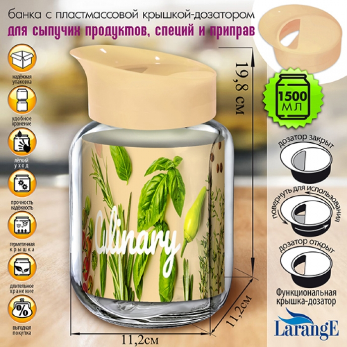 Банка для хранения стекл. 1,5 л с пласт. крышкой-дозатором цв. ВАНИЛЬ арт. 01271-00001