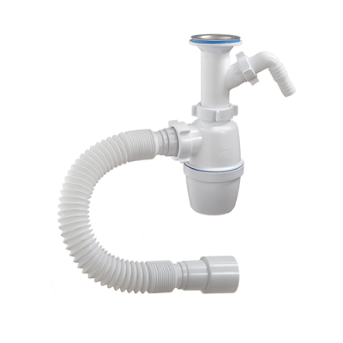 АВ-42059 Сифон бутылочный ОРИО с нерж.решеткой 70мм, с отводом и гиб.трубой 40-40/50