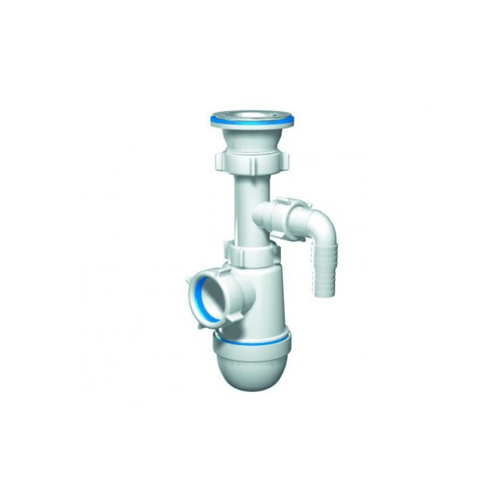 Сифон для кухонной мойки с диаметром сливного отверстия 50мм, бутылочного типа.С разборным выпуском и нержавеющей решеткой, с отводом для подключения бытовой техники. Выход для подключения к канализации 40мм.