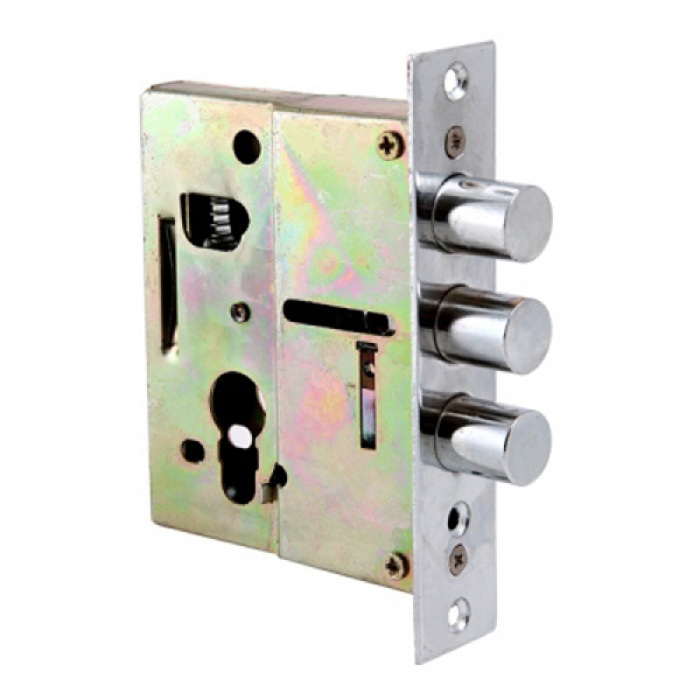 Предназначен для установки в двери китайского производства, в качестве дополнительного замка. Три цилиндрических стальных хромированных ригеля, диаметр 17,5мм. Вылет ригелей 21мм. Стальной корпус. Удаление ключевого отверстия 60мм. Цвет торцевой планки - хром, ширина 30мм.