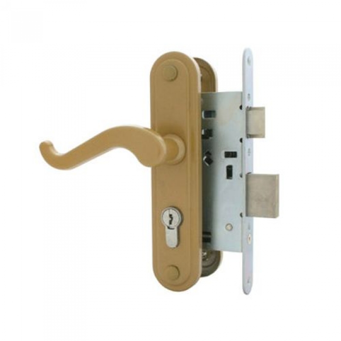 Замок врезной с ручками, цилиндровый. Предназначен для установки в деревянные двери толщиной 40-50мм, правого и левого открывания. Дверь может быть закрыта на защелку и открыта с помощью фалевой ручки при открытом засове замка. Прямоугольный ригель, вылет 22мм. Стальной оцинкованный корпус. Межосевое расстояние 55мм. Удаление ключевого отверстия 54мм. Ручки - алюминий, покрытие - краска. Цилиндр 60мм, 4 ключа. Заявленная секретность 15000 кодовых комбинаций.