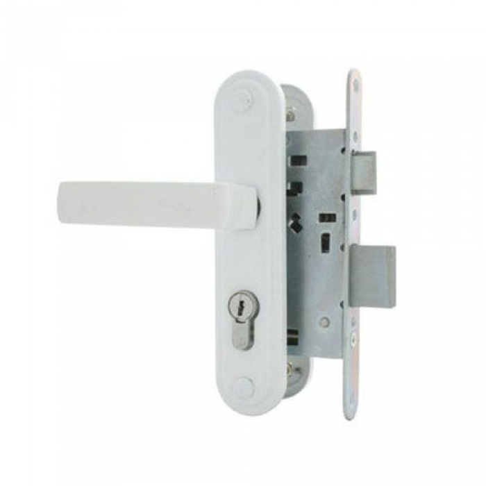 Замок врезной с ручками, цилиндровый. Предназначен для установки в деревянные двери толщиной 40-50мм, правого и левого открывания. Дверь может быть закрыта на защелку и открыта с помощью фалевой ручки при открытом засове замка. Прямоугольный ригель, вылет 22мм. Стальной оцинкованный корпус. Межосевое расстояние 55мм. Удаление ключевого отверстия 54мм. Ручки - алюминий, покрытие - краска. Цилиндр 60мм, 4 ключа. Заявленная секретность 15000 кодовых комбинаций.