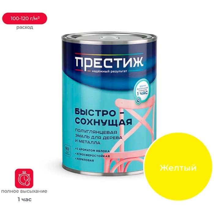Эмаль быстросохнущая полуглянцевая Престиж акриловая для метала и дерева Желтая 0,9 кг