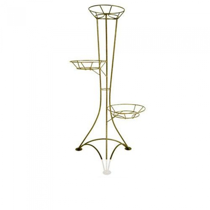 изготовлена из прочного стального прутка диаметром 8мм, окрашенного порошковой краской в золотистый с черным цвет. Состоит из 3-х корзинок, 2 из которых имеют размер: нижнее кольцо корзинки 14,5см, верхнее кольцо корзинки 22см, высота корзинки 3,5см, и 1 корзинки с размерами: нижнее кольцо корзинки 16,5см, верхнее кольцо корзинки 24см, высота корзинки 3,5см, которые располагаются ассиметрично для просторного роста Ваших растений. Эта напольная подставка прекрасно впишется в любой интерьер, даже если помещение окажется небольшим, и станет его бесспорным украшением. Высота подставки 97см, ширина 43см, глубина43 см. Вес этого изделия составляет 2,3кг.