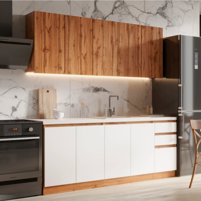 Кухня Игни Венера 2.0 дуб вотан+мрам бел зол (ШВБ400/800/800,ШНБ3Я400,ШНБ800,ШНМБ800,стол бел 26мм)