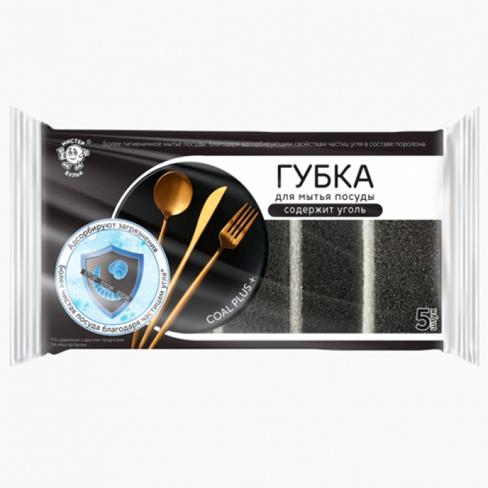 Губка Мистер Бульк для мытья посуды с углем 5 шт, размер 88/60/30, МБ125