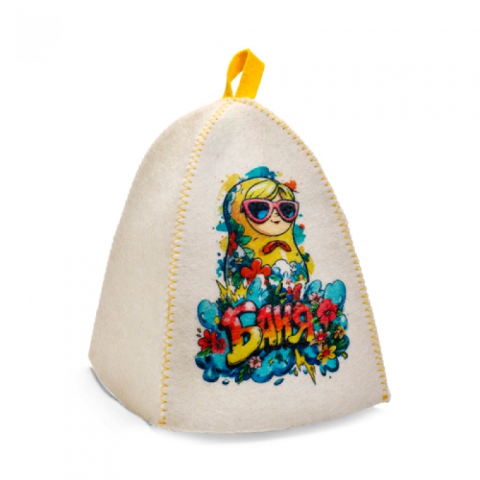 Шапка для бани с принтом "Матрешка в очках", белая 10925621