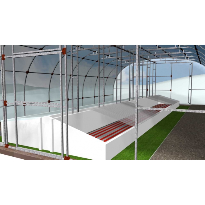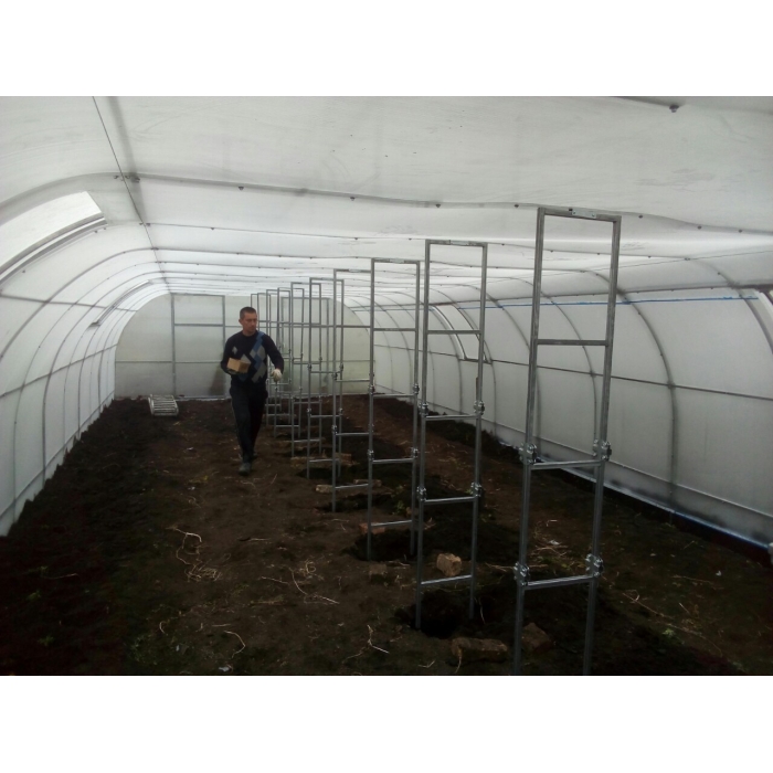Периметр дуги 8м. В каждом торце предполагается по 2е двери. Подпорки, установленные по центру теплицы, являются несущими и в зимний период усиливают каркас, предохраняя от обрушения.