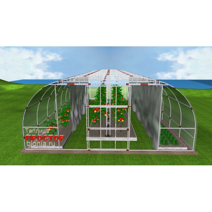 Теплица “Простор 2Д” изготовлена из квадратной оцинкованной стальной трубы, ГОСТ 8639-82 с сечением квадрат 20х20мм с высокой защитой от коррозии.