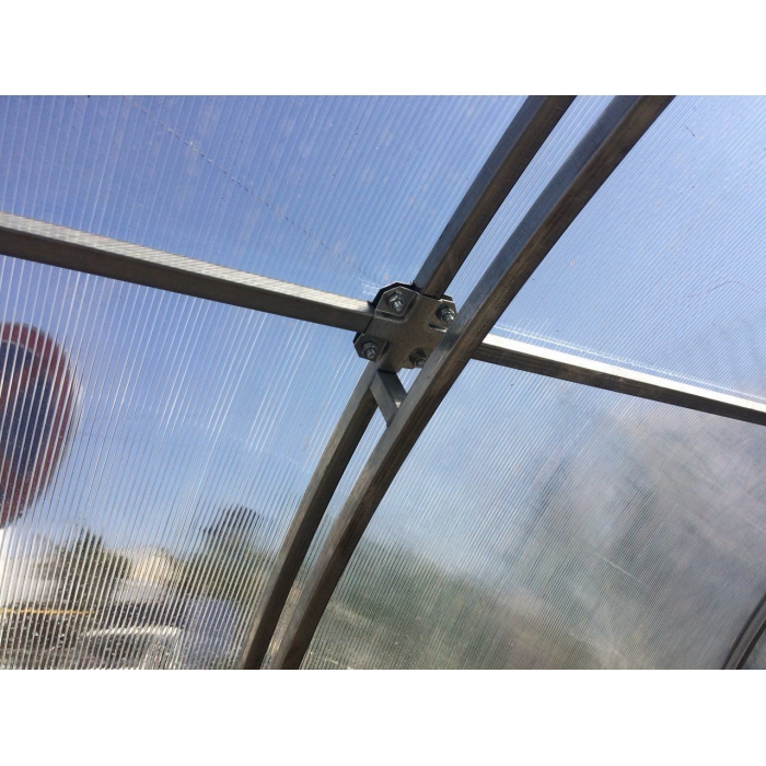 Поликарбонат толщиной 4 мм, плотный, с защитой от ультрафиолета в толще и на поверхности листа, производства «Polygal Plastics». За дополнительную плату теплицу можно укомплектовать поликарбонатом толщиной 6мм. Крепление поликарбоната осуществляется кровельными саморезами с резиновой пресс шайбой через оцинкованную ленту.
